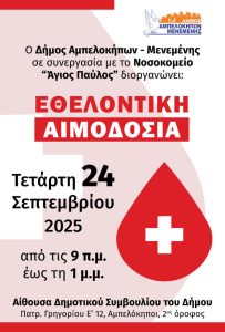 Ο Δήμος Αμπελοκήπων-Μενεμένης ανακοινώνει ότι η εθελοντική αιμοδοσία που είχε ανακοινωθεί για τις 8 Σεπτεμβρίου 2025 αναβάλλεται για την Τετάρτη 24 Σεπτεμβρίου 2025, στην αίθουσα Δημοτικού Συμβουλίου (Πατρ. Γρηγορίου Ε’ 12, Αμπελόκηποι, 2ος όροφος) από τις 09:00 π.μ. έως 1:00 μ.μ.
