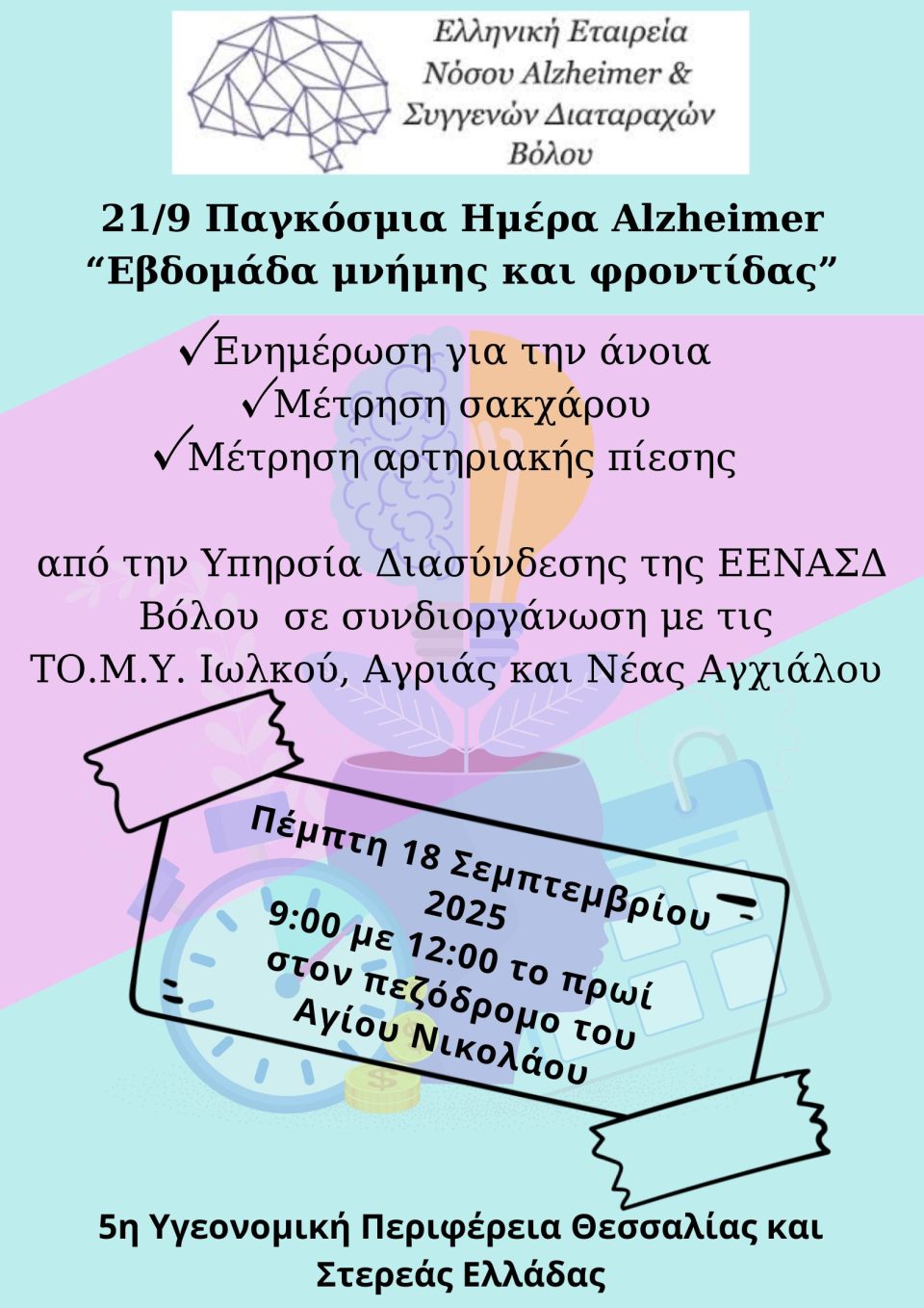 Η Παγκόσμια ημέρα Alzheimer γιορτάζεται στις 21 Σεπτεμβρίου και η Ελληνική Εταιρεία Νόσου Alzheimer & Συγγενών Διαταραχών Βόλου διοργανώνει πλήθος εκδηλώσεων με στόχο την ενημέρωση και την πρόληψη.