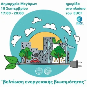 Ο Δήμος Μεγαρέων, στο πλαίσιο της συμμετοχής του στο European City Facility (EUCF), διοργανώνει ημερίδα με τίτλο: «Βελτίωση ενεργειακής βιωσιμότητας του Δήμου Μεγαρέων» την Πέμπτη 18 Σεπτεμβρίου 2025, από τις 17:00 έως τις 20:00, στην αίθουσα του Δημοτικού Συμβουλίου, στο Δημαρχείο Μεγάρων.