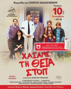 Ο Δήμος Ελληνικού – Αργυρούπολης παρουσιάζει την Τετάρτη 10 Σεπτεμβρίου και ώρα 20:30 στο Ανοιχτό Πέτρινο Θέατρο Αργυρούπολης τη μαύρη κωμωδία «Χάσαμε τη θεία, στοπ», ένα έργο-σταθμό του σημαντικού συγγραφέα Γιώργου Διαλεγμένου.👈