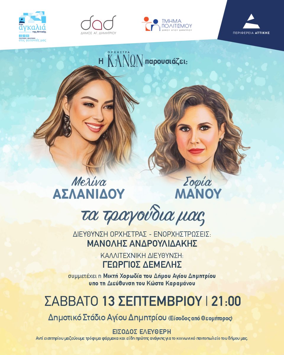 Η Ορχήστρα «ΚΑΝΩΝ» παρουσιάζει το Σάββατο 13 Σεπτεμβρίου 2025 στο Πλαίσιο του Φεστιβάλ Πόλης 2025 του Δήμου Αγίου Δημητρίου, μια μουσική βραδιά που θα μείνει αξέχαστη, με την Μελίνα Ασλανίδου και τη Σοφία Μάνου. Οι δύο ερμηνεύτριες ενώνουν τις φωνές τους και μας χαρίζουν μοναδικές ερμηνείες στη συναυλία με τίτλο «Τα τραγούδια μας».