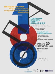 Η Συμφωνική Ορχήστρα Δήμου Θεσσαλονίκης τιμά τα 100 χρόνια από την Ίδρυση του Αριστοτελείου Πανεπιστημίου Θεσσαλονίκης με μια μεγάλη συναυλία στο Δημοτικό Θέατρο Κήπου με τη συμμετοχή της Χορωδίας του ΑΠΘ «Γιάννης Μάντακας» το Σάββατο 20 Σεπτεμβρίου 2025 στις 21.00, στο Δημοτικό Θέατρο Κήπου.