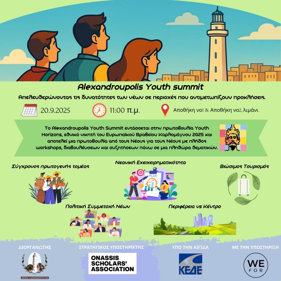 Το φετινό Youth Summit στην Αλεξανδρούπολη θα αποτελέσει έναν ανοιχτό χώρο συνάντησης, όπου νέοι και νέες της περιοχής θα έχουν την ευκαιρία να συζητήσουν και να ανταλλάξουν εμπειρίες γύρω από κρίσιμα ζητήματα που αφορούν το παρόν και το μέλλον τους.