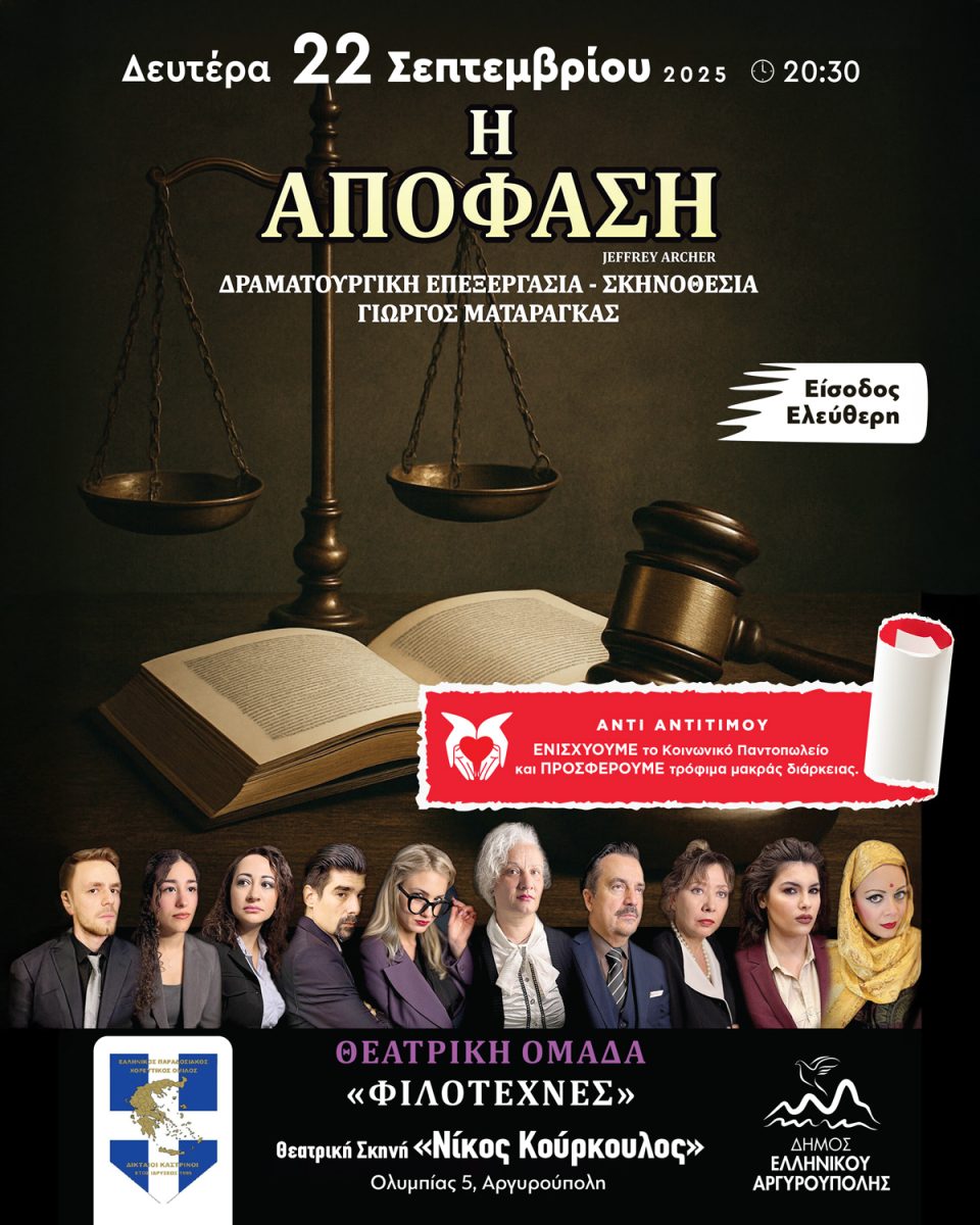 Τη Δευτέρα 22 Σεπτεμβρίου ώρα 20:30, στη Θεατρική Σκηνή «Νίκος Κούρκουλος» (Ολυμπίας 5, Αργυρούπολη), η θεατρική ομάδα «Φιλοτέχνες» παρουσιάζει σε δραματουργική επεξεργασία και σκηνοθεσία Γιώργου Ματαράγκα, το συναρπαστικό δικαστικό δράμα «Η Απόφαση», μια θεατρική παράσταση βασισμένη στο έργο του Jeffrey Archer «Ο Κατηγορούμενος».