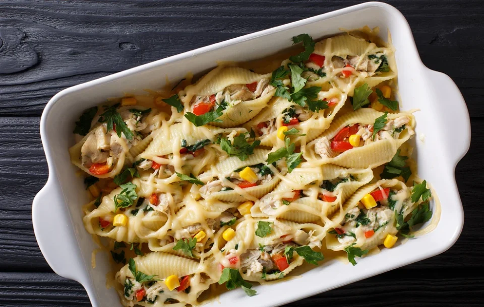 - Απλώστε 1 φλιτζάνι από τη σάλτσα ντομάτας στον πάτο ενός πυρέξ και γεμίστε τα κελύφη με το μείγμα ρικότας. Τοποθετήστε τα στο ταψί.
