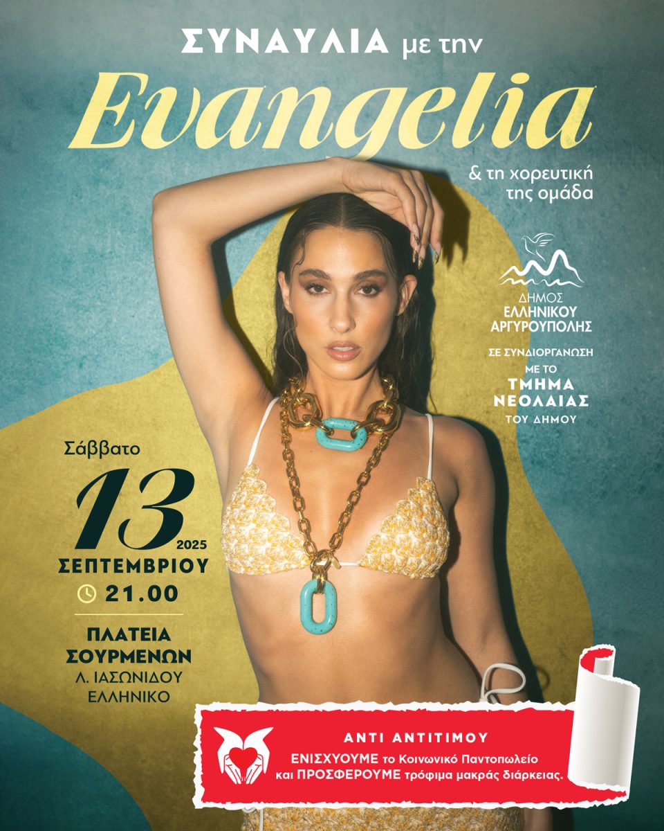 Ο Δήμος Ελληνικού – Αργυρούπολης, σε συνδιοργάνωση με το Τμήμα Νεολαίας, σας καλεί το Σάββατο 13 Σεπτεμβρίου και ώρα 21:00 στην Πλατεία Σουρμένων στο Ελληνικό, σε μια ξεχωριστή συναυλία της εκρηκτικής pop καλλιτέχνιδας Evangelia και της χορευτικής της ομάδας.