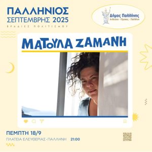 Ο Δήμος Παλλήνης σας προσκαλεί σε μία μεγάλη μουσική γιορτή, με τη μοναδική Ματούλα Ζαμάνη, την Πέμπτη 18 Σεπτεμβρίου 2025, στις 9 το βράδυ, στην Πλατεία Ελευθερίας, στην Παλλήνη.