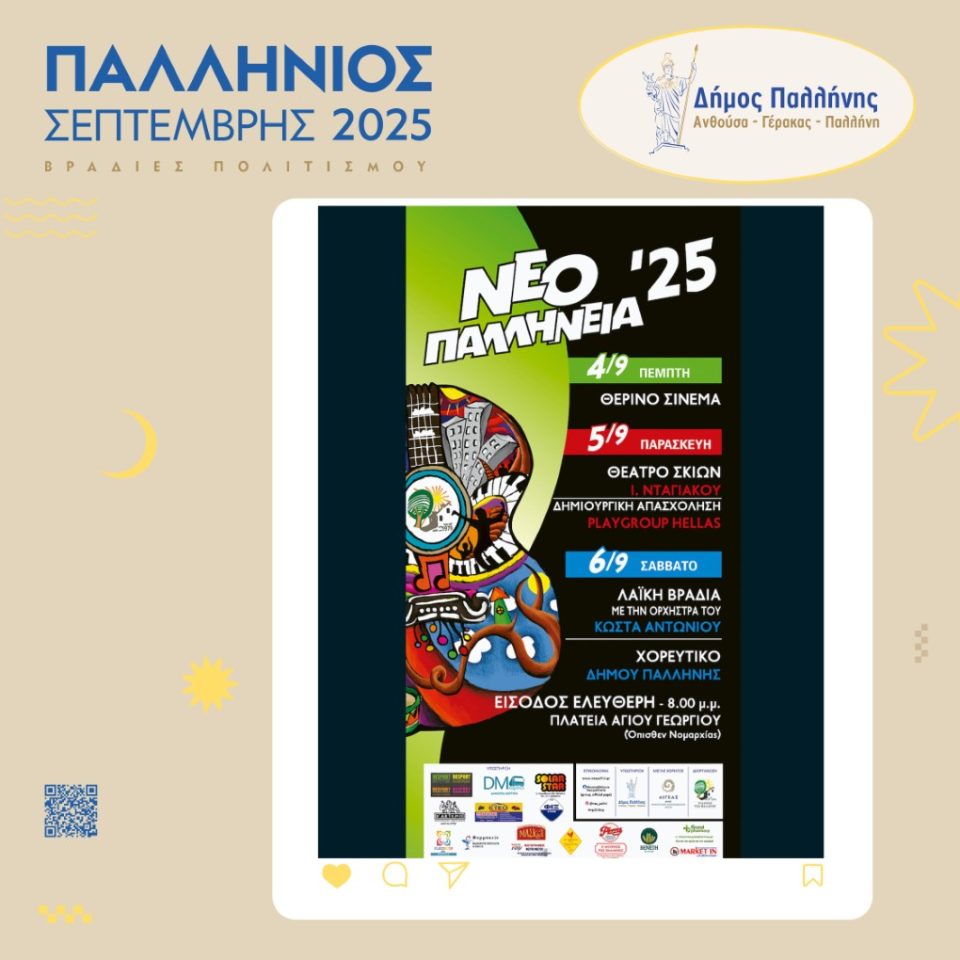 Στις 4, 5, και 6 Σεπτεμβρίου 2025, ώρα 8.00 μ.μ., στην Πλατεία Αγίου Γεωργίου στη Νέα Παλλήνη (πίσω από την έδρα της Περιφερειακής Ενότητας Ανατολικής Αττικής), τα “ΝΕΟΠΑΛΛΗΝΕΙΑ 2025” θα προσφέρουν στιγμές ψυχαγωγίας σε μικρούς και μεγάλους. Πρόκειται για ετήσια γιορτή, που διοργανώνεται από το 1979, με την οποία οι κάτοικοι της Νέας Παλλήνης αποχαιρετούν το καλοκαίρι και υποδέχονται το φθινόπωρο.