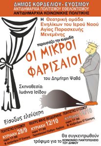 Την ευκαιρία να απολαύσουν την απολαυστική κωμωδία «Οι Μικροί Φαρισαίοι» θα έχουν οι φίλοι του θεάτρου, τόσο στο Πολιτιστικό Κέντρο Ευόσμου, όσο και στο Πολυλειτουργικό Κέντρο – Θέατρο «Μίκης Θεοδωράκης», στο Ελευθέριο – Κορδελιό.