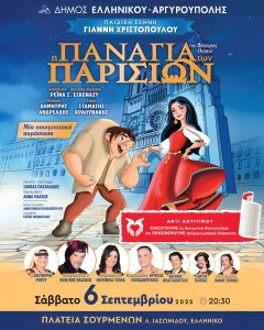 Ο Δήμος Ελληνικού- Αργυρούπολης παρουσιάζει το Σάββατο 6 Σεπτεμβρίου και ώρα 20:30 στην Πλατεία Σουρμένων στο Ελληνικό, την παιδική θεατρική παράσταση «Η Παναγία των Παρισίων» του Βίκτωρος Ουγκώ, από την Θεατρική Σκηνή του Γιάννη Χριστόπουλου.