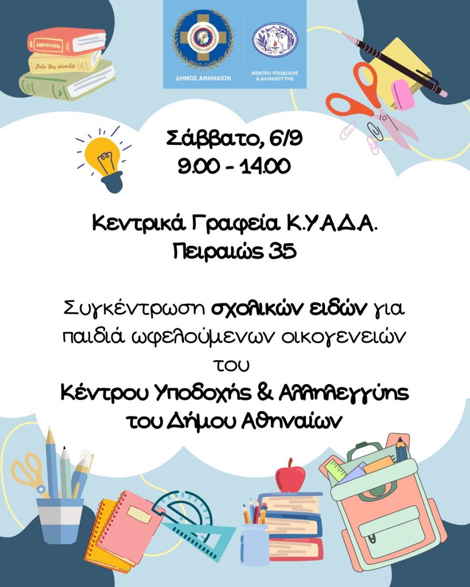Η νέα σχολική χρονιά είναι προ των πυλών. Ο Δήμος Αθηναίων, μέσα από το Κέντρο Υποδοχής και Αλληλεγγύης (Κ.Υ.Α.Δ.Α.), καλεί τους πολίτες να φέρουν σχολικά είδη και να στηρίξουν τα παιδιά των ωφελούμενων οικογενειών του φορέα. Οι κεντρικές εγκαταστάσεις του Κ.Υ.Α.Δ.Α., στην οδό Πειραιώς 35, θα παραμείνουν ανοιχτές για αυτόν τον σκοπό, το Σάββατο 6 Σεπτεμβρίου 2025, από τις 09.00 έως τις 14.00.