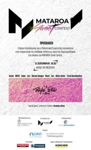Η εκτεταμένη δράση ολοκληρώνεται με το MATAROA Street Contest την Παρασκευή 12 Σεπτεμβρίου στις 18.30, στον Κήπο της Μεσογείου (νέα Παραλία) όπου και θα πραγματοποιηθεί η συνολική παρουσίαση της δράσης και των έργων street art. Περισσότεροι από 65 δημιουργοί ανταποκρίθηκαν στην φετινή πρόσκληση του σχετικού διαγωνισμού της Πολιτιστικής Εταιρείας, εκ των οποίων εννέα καλλιτέχνες επιλέχθηκαν για να δημιουργήσουν τα έργα τους στον Κήπο της Μεσογείου.
