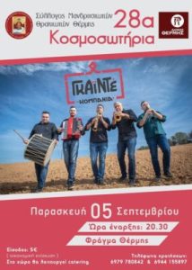 Τα 28α Κοσμοσωτείρια διοργανώνονται και φέτος από το Σύλλογο Μανδριτσιωτών Θρακιωτών Θέρμης, την Παρασκευή 5 Σεπτεμβρίου, στο Φράγμα Θέρμης. Αναλυτικά το πρόγραμμα των τριήμερων εκδηλώσεων έχει ως εξής: