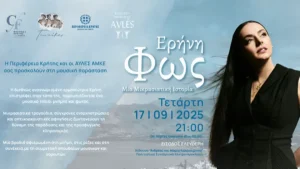 Στο πλαίσιο της παράλληλης δράσης του 5ου Φεστιβάλ Κρήτης «Γυναίκες», που υλοποιείται για 2η συνεχόμενη χρονιά, με την υποστήριξη του Αυτοτελούς Γραφείου Ισότητας της Περιφέρειας Κρήτης, παρουσιάζεται η συναυλία «Ερήνη – Φως: Μια Μικρασιατική Ιστορία», την Τετάρτη 17 Σεπτεμβρίου, στις 9:00μ.μ. (οι πόρτες ανοίγουν στις 8:00μ.μ.), στο Πολιτιστικό Συνεδριακό Κέντρο Ηρακλείου, στην Αίθουσα «Ανδρέας και Μαρία Καλοκαιρινού», με ελεύθερη είσοδο.