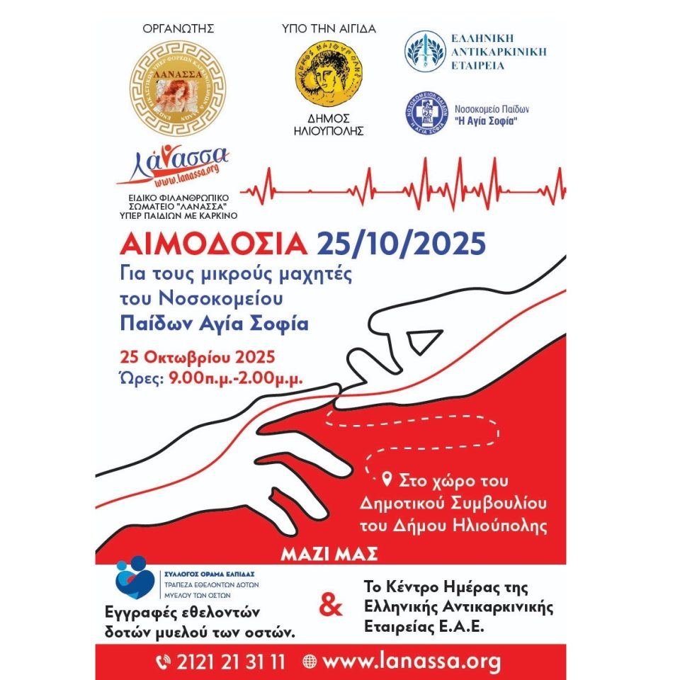 O Δήμος Ηλιούπολης με αυξημένο αίσθημα κοινωνικής ευθύνης αγκάλιασε μία σημαντική πρωτοβουλία του Ειδικού Φιλανθρωπικού Σωματείου ΛΑΝΑΣΣΑ υπέρ παιδιών με Καρκίνο σε συνεργασία με την Ελληνική Αντικαρκινική Εταιρία, το Όραμα Ελπίδας, το «Κέντρο Ημέρας ψυχολογικής υποστήριξης παιδιών και εφήβων, με νεοπλασίες» και το Σώμα εθελοντών του Δήμου Ηλιούπολης «Η Γειτονιά μας» για τη διοργάνωση της εν λόγω αιμοδοσίας.