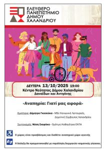Τη Δευτέρα 13/10 και ώρα 19:00 στο Κέντρο Νεότητας (Δαναΐδων & Αντιγόνης) το Ελεύθερο Πανεπιστήμιο του Δήμου Χαλανδρίου φιλοξενεί την πολύ μεγάλης κοινωνικής σημασίας εκδήλωση με θέμα: «Αναπηρία: Γιατί μας αφορά;»