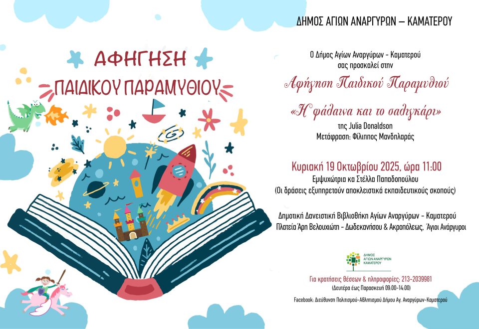 ΚεντρικήΚοινωνικάΑφήγηση παιδικού παραμυθιού «η φάλαινα και το σαλιγκάρι» by xristiana15 Οκτωβρίου 202515 Οκτωβρίου 2025044 Share00 15/10/2025 Ενημερώνουμε ότι την Κυριακή 19 Οκτωβρίου και ώρα 11.00 θα πραγματοποιηθεί αφήγηση παιδικού παραμυθιού, «η φάλαινα και το σαλιγκάρι», στη Δημοτική Βιβλιοθήκη Αγίων Αναργύρων-Καματερού στην πλατεία Άρη Βελουχιώτη.