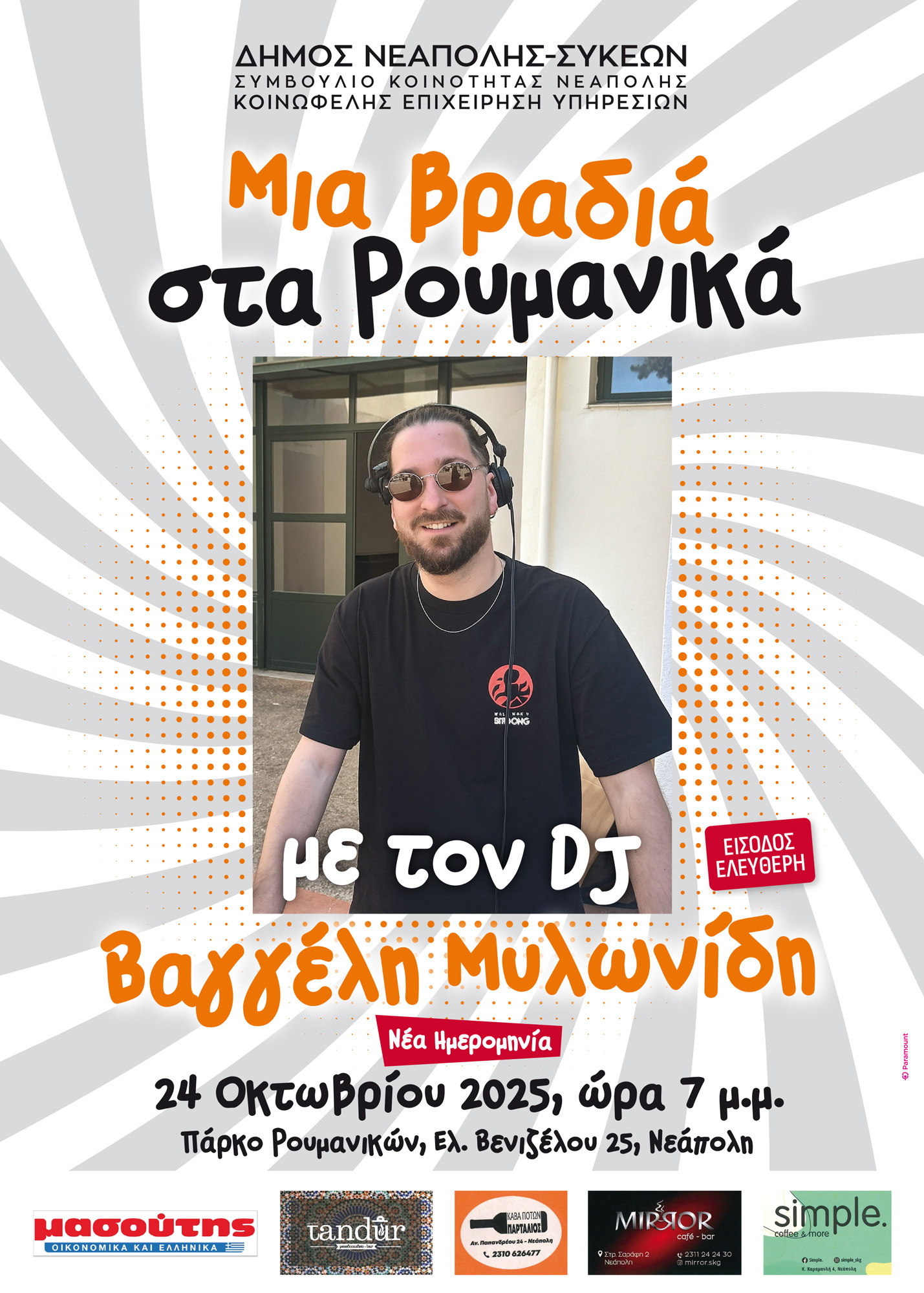 Αυτή την Παρασκευή 24 Οκτωβρίου, από τις 7 το απόγευμα μικροί και μεγάλοι είναι καλεσμένοι στο Πάρκο των Ρουμανικών, σε ένα κεφάτο πάρτι γεμάτο μουσική και χορό με τον DJ Βαγγέλη Μυλωνίδη και ελεύθερη είσοδο για όλους.