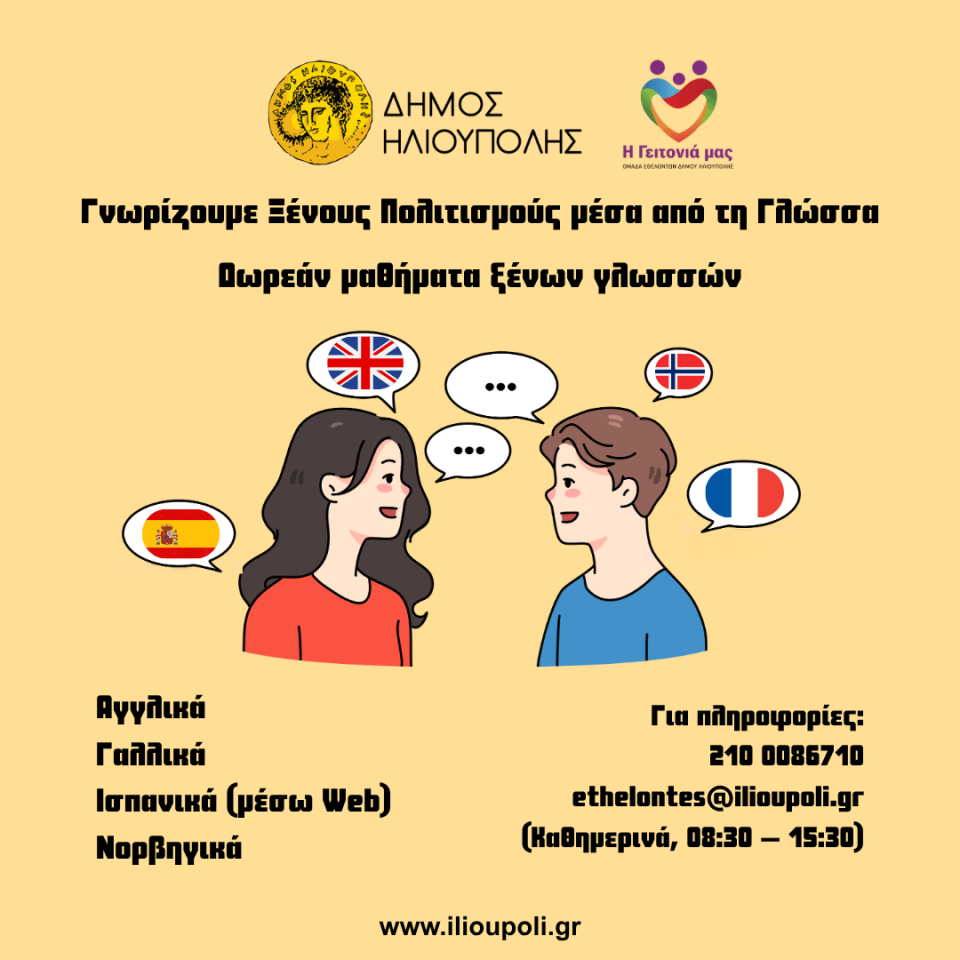 Για ακόμη μία χρονιά, η Εθελοντική Ομάδα του Δήμου Ηλιούπολης συνεχίζει τη δράση γνωριμίας των δημοτών με ξένους πολιτισμούς μέσα από δωρεάν μαθήματα ξένων γλωσσών.