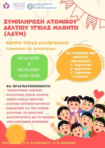 Στο Κέντρο Υγείας Δραπετσώνας (Ταξιαρχών 128), στις 2 & 9 Οκτωβρίου 2025, 14:00 – 18:00, θα πραγματοποιηθεί δράση που περιλαμβάνει: