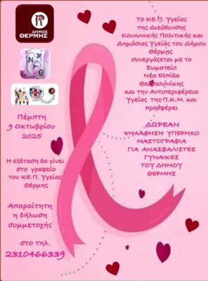 Το ΚΕ.Π. Υγείας Θέρμης της Διεύθυνσης Κοινωνικής Πολιτικής και Δημόσιας Υγείας Θέρμης συνεργάζεται με το Σωματείο Νέα Ελπίδα Θεσσαλονίκης και την Αντιπεριφέρεια Υγείας της Π.Κ.Μ. και προσφέρει δωρεάν Μαστολογικό έλεγχο σε ανασφάλιστες γυναίκες του Δήμου Θέρμης την Πέμπτη 9 Οκτωβρίου 2025 , ο οποίος θα πραγματοποιηθεί στο ΚΕ.Π.Υγείας Θέρμης (1ο χλμ Θέρμης -Τριαδίου δίπλα στο κλειστό γυμναστήριο ‘’Γιώργος Κουγιάμης’’ Αστικό 67 στάση Γυμναστήριο) από την Γενική Χειρουργό Ειδικό Παθήσεων Μαστού Dr. Γιώτα Σασοπούλου.