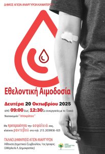 Σας ενημερώνουμε ότι τη Δευτέρα 20 Οκτωβρίου 2025 και ώρα 09.00 θα πραγματοποιηθεί εθελοντική αιμοδοσία στην αίθουσα του Δημοτικού Συμβουλίου στο παλαιό Δημαρχείο Αγίων Αναργύρων. Προηγουμένως πρέπει να κλείσετε ραντεβού στο 21320239936 και 2132039925.