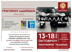 Στον Δημοτικό Πολυχώρο «Γαλαξίας» θα πραγματοποιηθεί Έκθεση Φωτογραφιών από το Αρχείο του φακέλου του Γρηγόρη Λαμπράκη που τηρούσε η Ασφάλεια, από τη Δευτέρα 13 Οκτωβρίου έως το Σάββατο 18 Οκτωβρίου, στο πλαίσιο της οργάνωσης του Historical Run 2025.