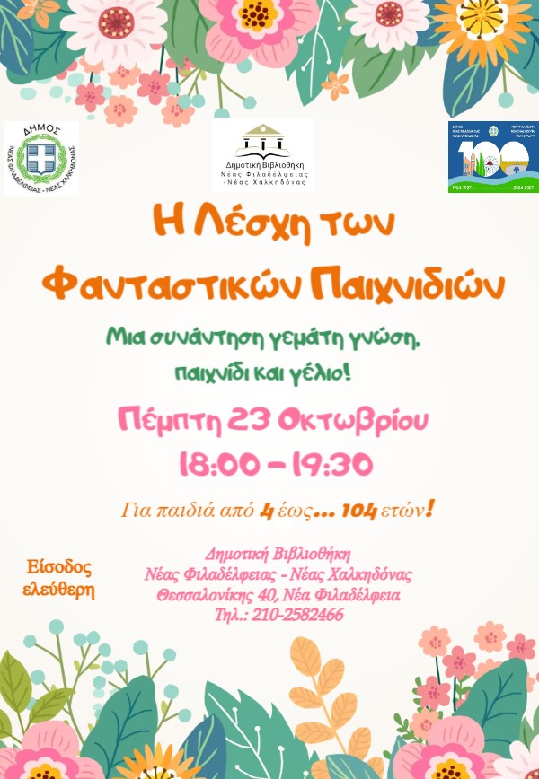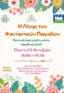 Με χαρά σας προσκαλούμε σε μια συνάντηση γεμάτη γνώση, παιχνίδι και γέλιο! Σας περιμένουμε την Πέμπτη 23 Οκτωβρίου από τις 18:00 έως τις 19:30 να διασκεδάσουμε και να μάθουμε παίζοντας επιτραπέζια παιχνίδια.