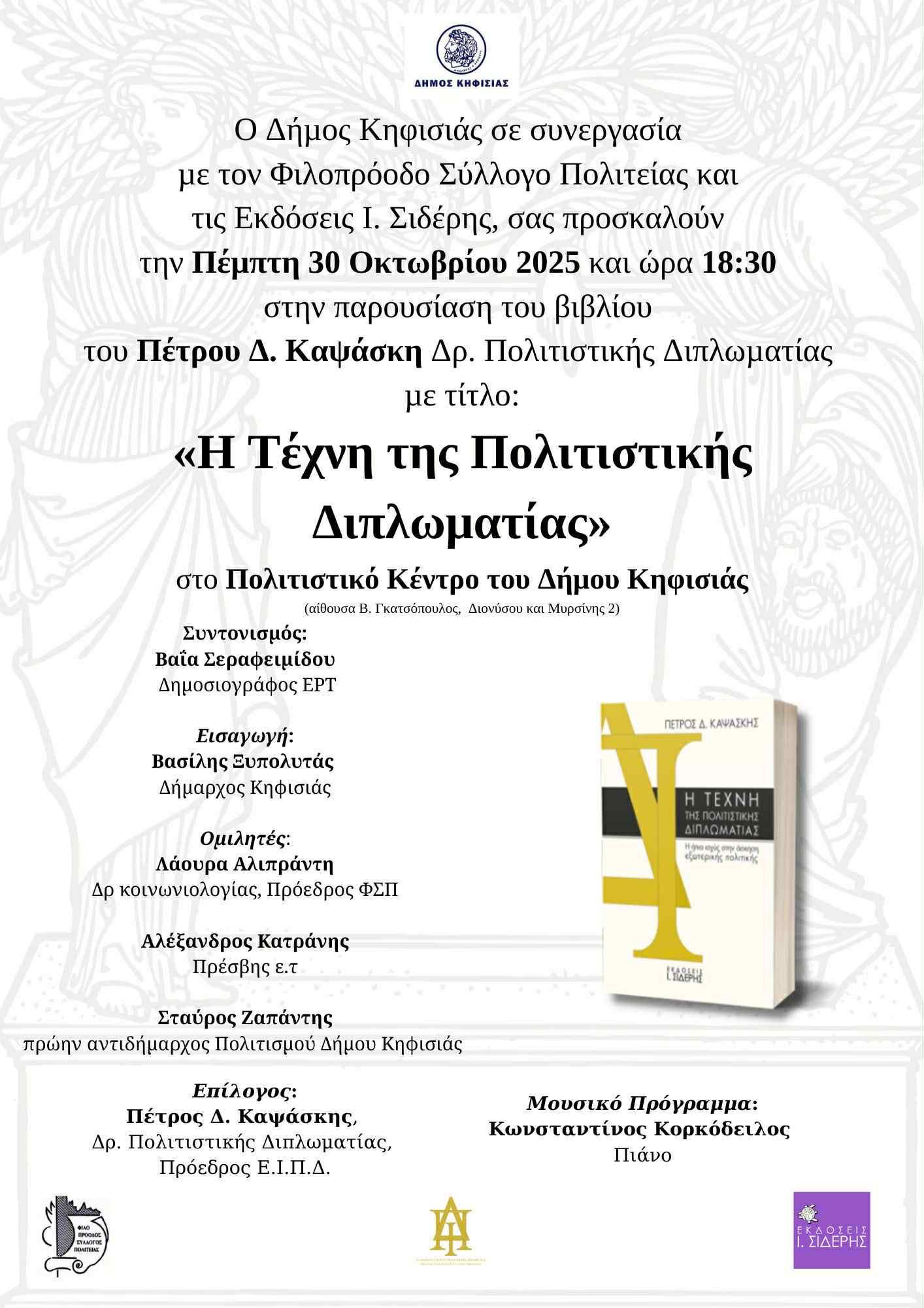 Ο Δήμος Κηφισιάς σε συνεργασία με τον Φιλοπρόοδο Σύλλογο Πολιτείας και τις Εκδόσεις Ι. Σιδέρης, σας προσκαλούν την Πέμπτη 30 Οκτωβρίου 2025 και ώρα 18:30 στην παρουσίαση του βιβλίου του Πέτρου Δ. Καψάσκη Δρ. Πολιτιστικής Διπλωματίας με τίτλο: «Η Τέχνη της Πολιτιστικής Διπλωματίας».