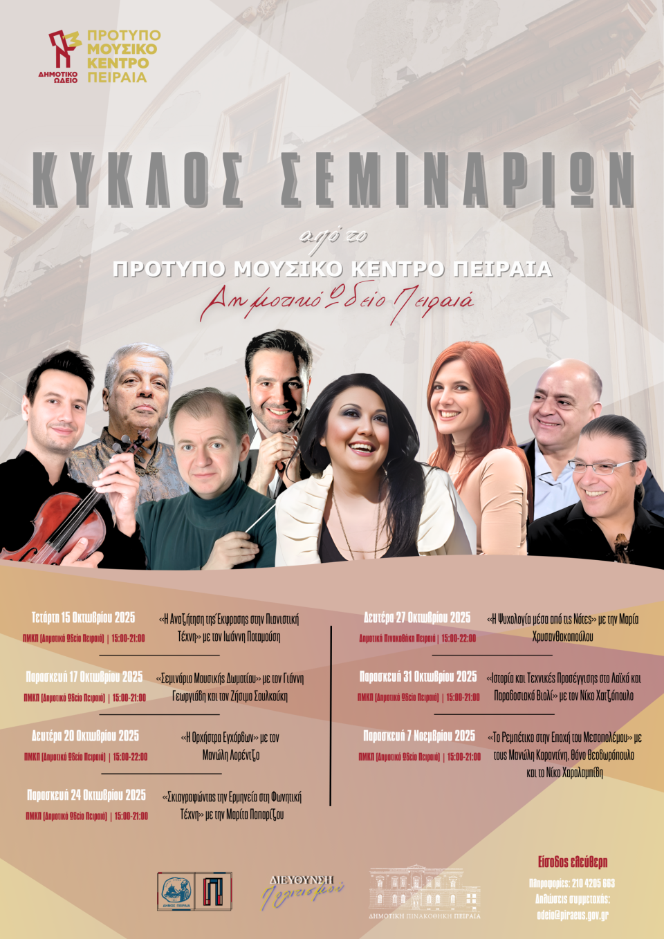 Τα σεμινάρια, στα οποία μπορούν να παρακολουθήσουν όλοι οι ενδιαφερόμενοι, θα πραγματοποιηθούν στις κτιριακές εγκαταστάσεις του Πρότυπου Μουσικού Κέντρου Πειραιά (Αντ/χου Π.Ν. Παν. Βλαχάκου 34 & Σαλαμίνος, Αγ. Σοφία) και στη Δημοτική Πινακοθήκη Πειραιά (Φίλωνος 29) και η είσοδος για το κοινό θα είναι δωρεάν.