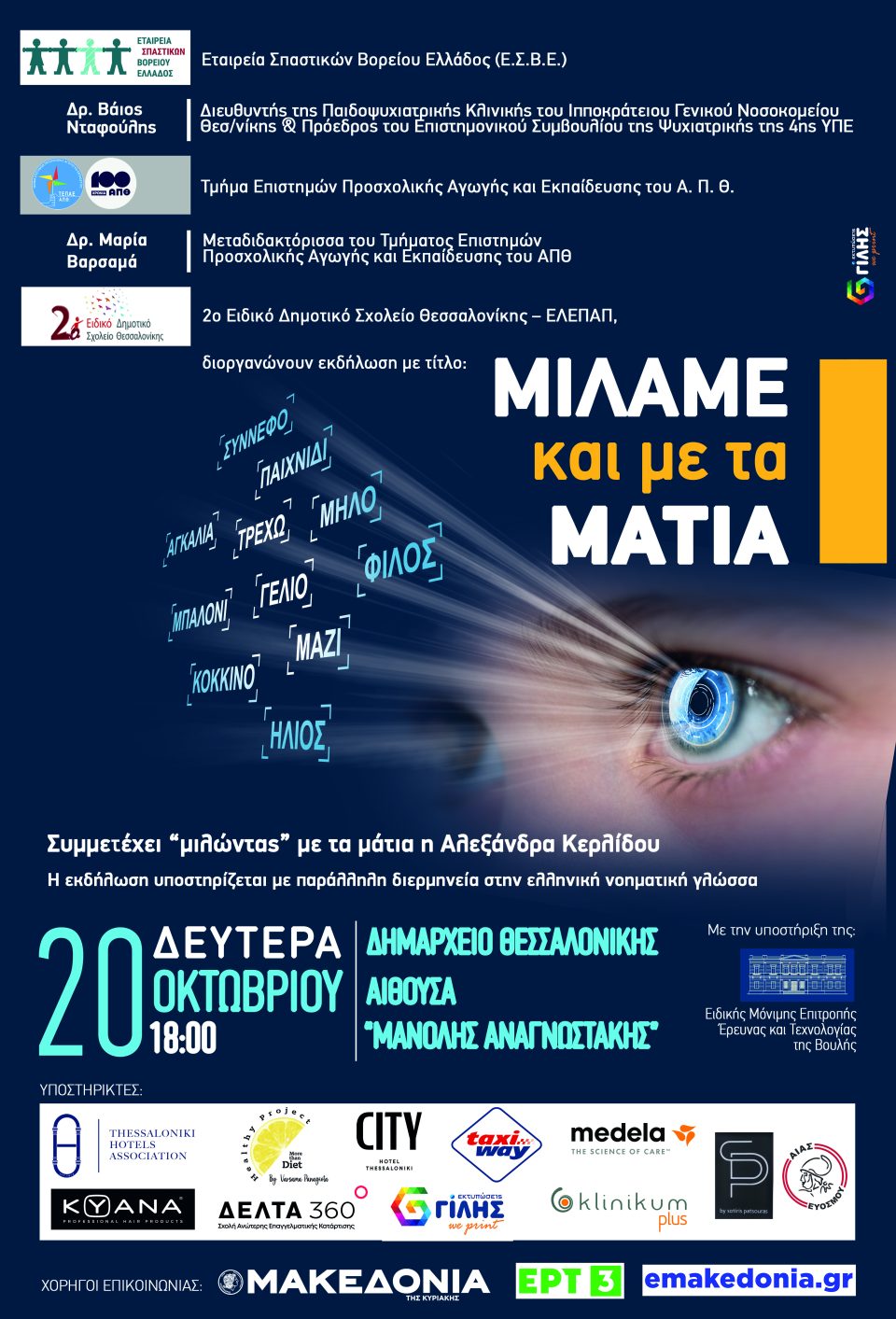 Η Εταιρεία Σπαστικών Βορείου Ελλάδος (Ε.Σ.Β.Ε.) σε συνεργασία με τον Διευθυντή της Παιδοψυχιατρικής Κλινικής του Ιπποκράτειου Γενικού Νοσοκομείου Θεσσαλονίκης και Πρόεδρο του Επιστημονικού Συμβουλίου της Ψυχιατρικής της 4ης ΥΠΕ, Δρ. Βάιο Νταφούλη, το Τμήμα Επιστημών Προσχολικής Αγωγής και Εκπαίδευσης του Αριστοτελείου Πανεπιστημίου Θεσσαλονίκης, τη Δρ. Μαρία Βαρσαμά, Μεταδιδακτόρισσα του Τμήματος Επιστημών Προσχολικής Αγωγής και Εκπαίδευσης του ΑΠΘ και το 2ο Ειδικό Δημοτικό Σχολείο Θεσσαλονίκης – ΕΛΕΠΑΠ, διοργανώνει εκδήλωση με τίτλο: