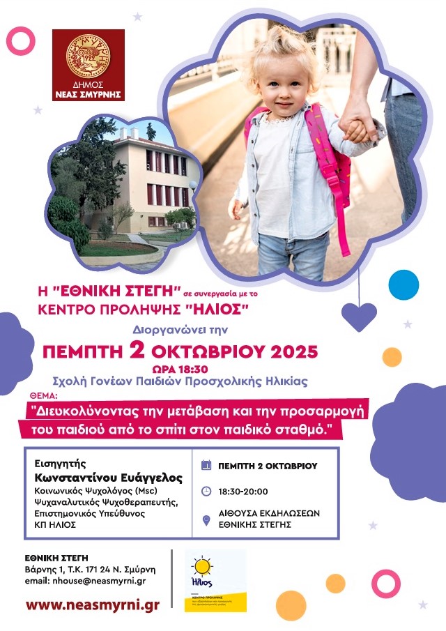 Ξεκινά την Πέμπτη 2 Οκτωβρίου στις 18:30 ο νέος Κύκλος Σεμιναρίων Γονέων Παιδιών Προσχολικής Ηλικίας στην Εθνική Στέγη (Βάρνης 1) είσοδος ελεύθερη.