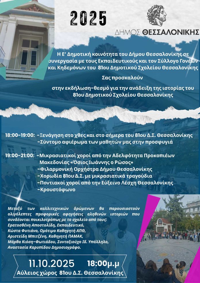 Ο Δήμος Θεσσαλονίκης, η Ε΄ Δημοτική Κοινότητα, ο Σύλλογος Διδασκόντων και ο Σύλλογος Γονέων και Κηδεμόνων του 81ου Δημοτικού Σχολείου διοργανώνουν εκδήλωση στον χώρο του 81ου Δημοτικού Σχολείου (Δελφών 131) με θέμα “Ανάδειξη της ιστορίας του σχολείου” το Σάββατο 11 Οκτωβρίου 2025 και ώρα 17:00.