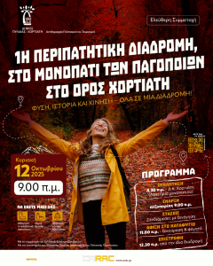 H «1η Περιπατητική Διαδρομή στο Μονοπάτι των Παγοποιών», θα πραγματοποιηθεί την Κυριακή 12 Οκτωβρίου 2025, με ώρα έναρξης 9:00 π.μ., και απευθύνεται σε όλους όσοι θέλουν να συνδυάσουν άσκηση, γνώση και εμπειρία μέσα στη φύση, ανεξαρτήτου ηλικίας.