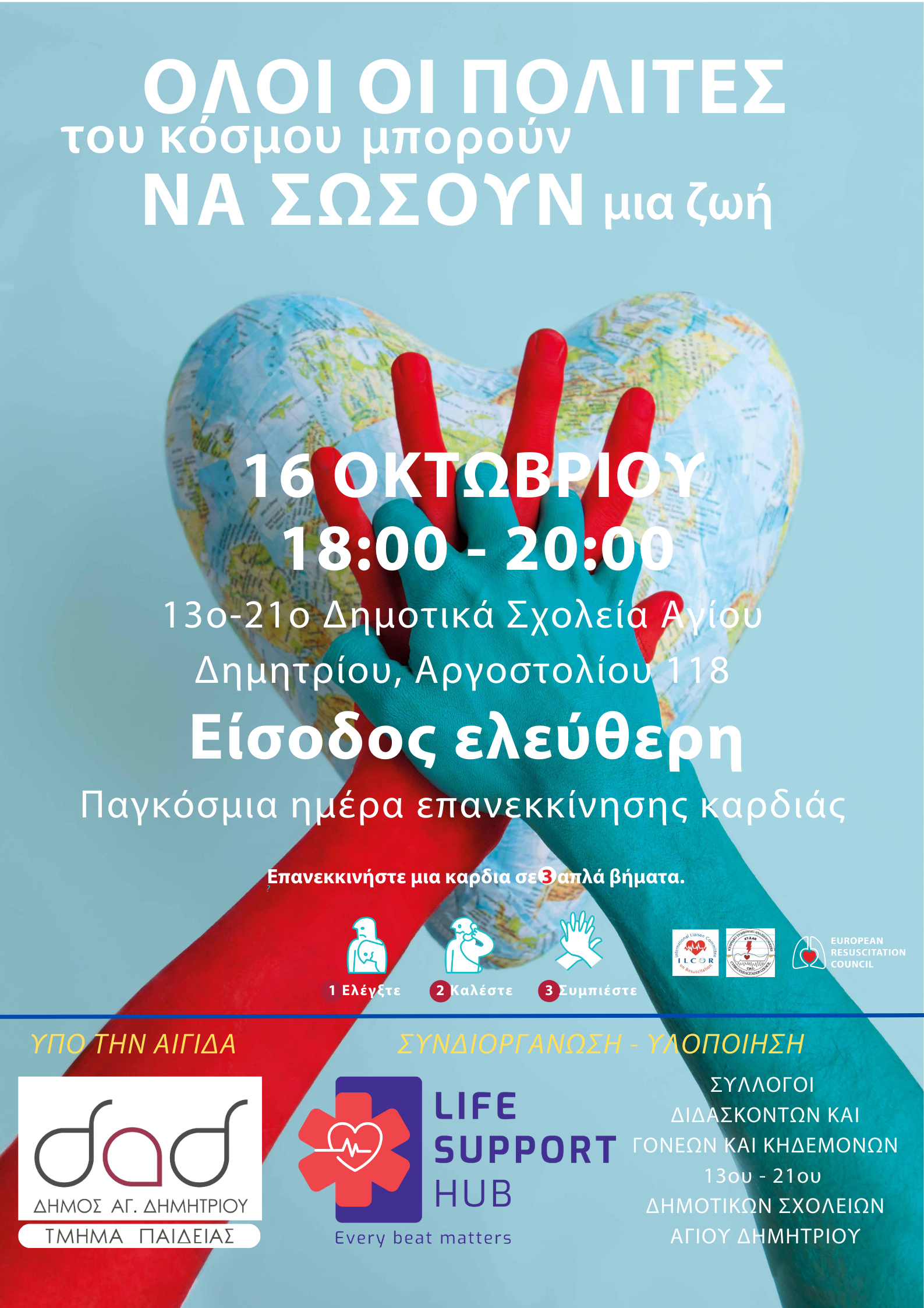 Με αφορμή τον εορτασμό της Παγκόσμιας Ημέρας Επανεκκίνησης της Καρδιάς θα πραγματοποιηθεί ανοιχτή εκδήλωση στο 13ο και 21ο Δημοτικό σχολείο Αγίου Δημητρίου στις 16 Οκτωβρίου από τις 18:00 -20:00 (Αργοστολίου 118).