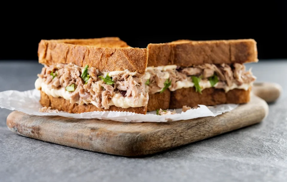 4. Μοιράστε την τονοσαλάτα ανάμεσα στις δύο φέτες ψωμιού με τη ρόκα.