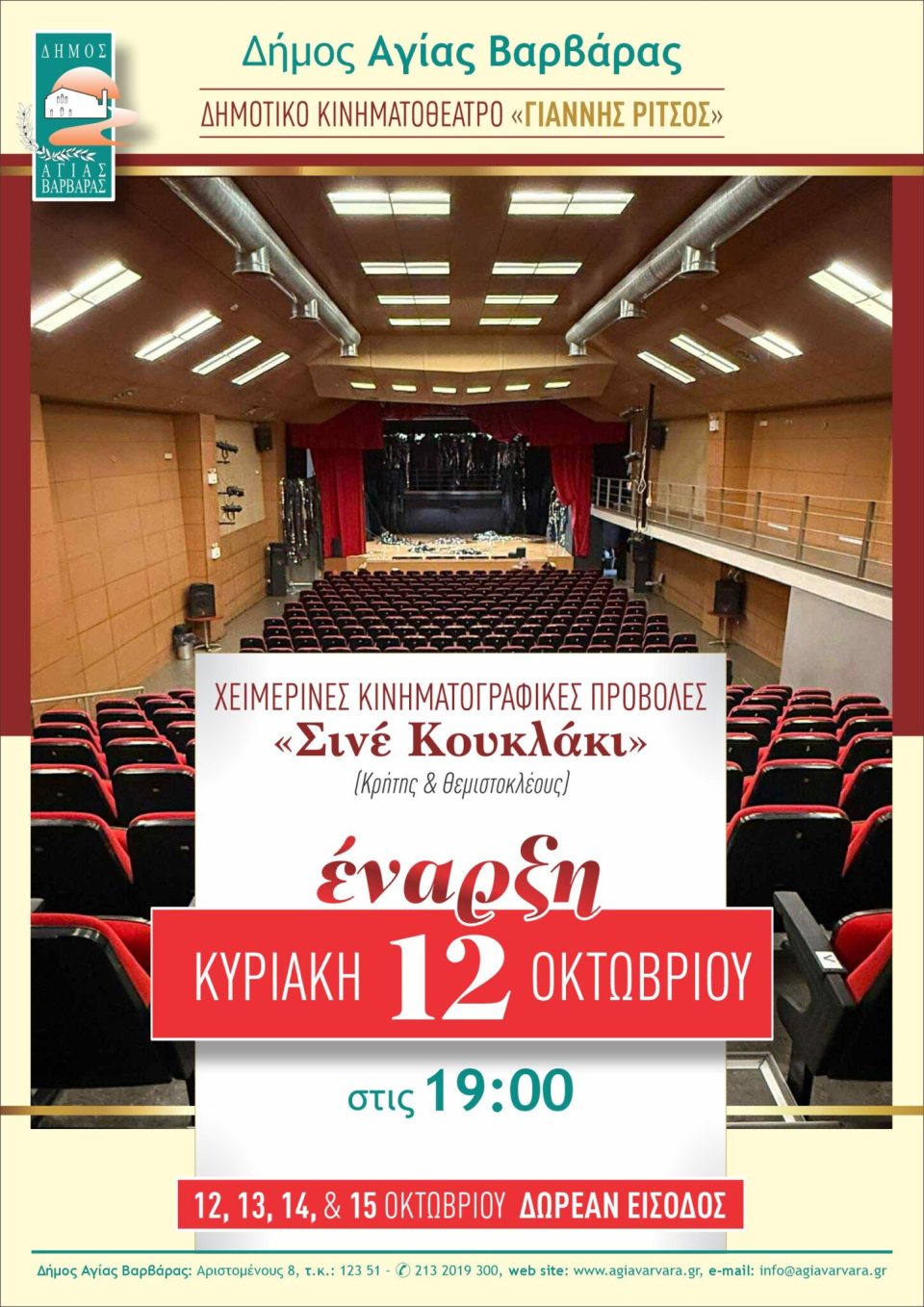 Στο δημοτικό κινηματοθέατρο “Γιάννης Ρίτσος”, το πολιτισμικό στολίδι της πόλης μας, από αυτό το φθινόπωρο αναβιώνει το ιστορικό “Σινέ Κουκλάκι” της Αγίας Βαρβάρας!! Σινέ Κουκλάκι λοιπόν, για να θυμηθούν οι πιο παλιοί, για να μάθουν οι νεότεροι, πως η ιστορία της πόλης μας, περιείχε ηχοχρώματα πολιτισμού, με καρδιά και ψυχή, με εικόνες και συναισθήματα, με τα φώτα των προβολέων και τα χαμόγελα των θεατών.