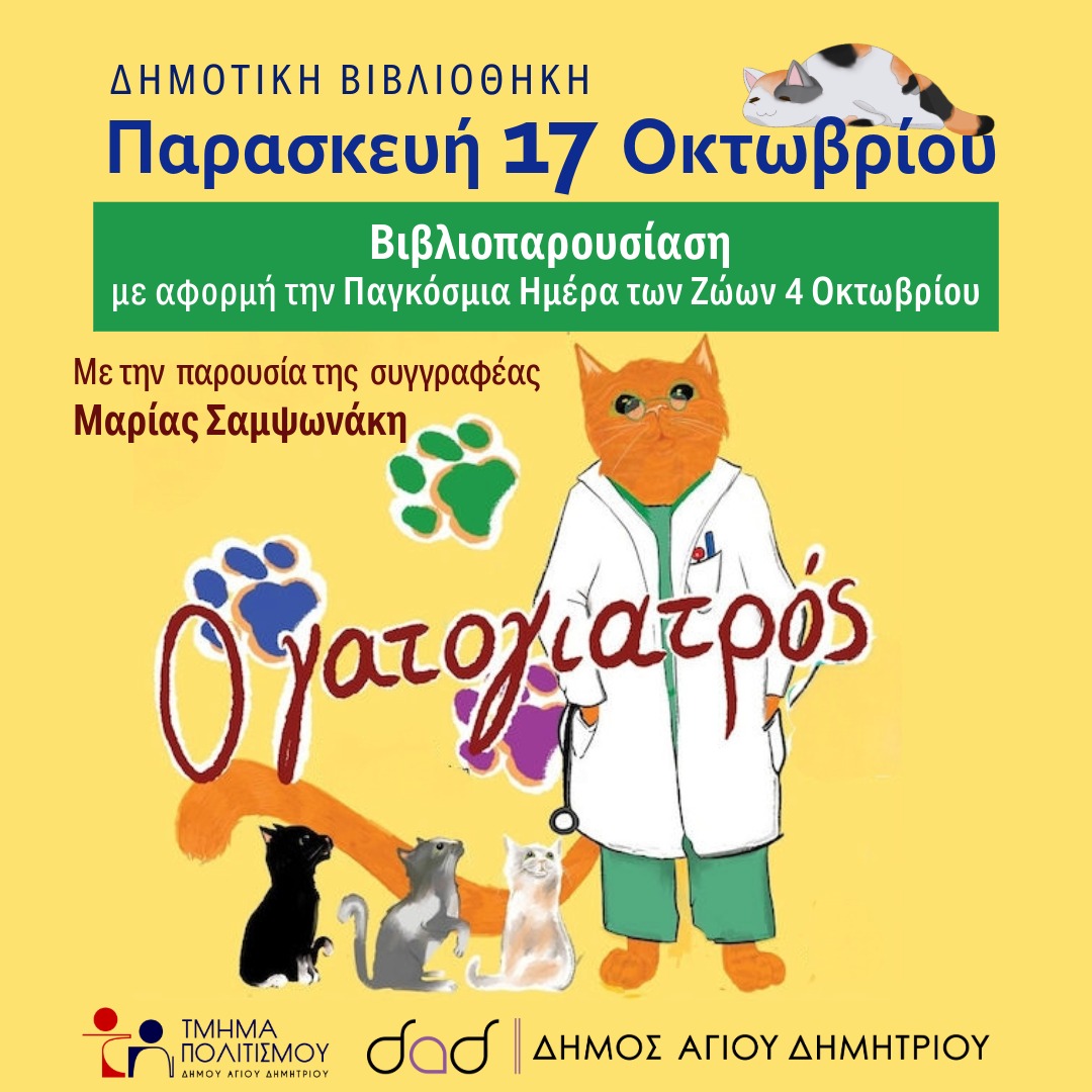 Η πρώτη παρουσίαση θα πραγματοποιηθεί την Παρασκευή 17 Οκτωβρίου, με τη συγγραφέα Μαρία Σαμψωνάκη και το βιβλίο της «Ο Γατογιατρός», με αφορμή την Παγκόσμια Ημέρα των Ζώων, στις 4 Οκτωβρίου.