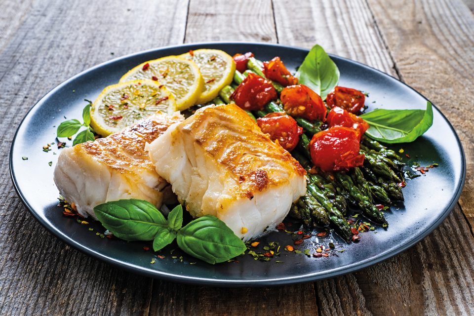 Ακουμπάμε τα φιλέτα μπακαλιάρου πάνω στα λαχανικά. Αλατοπιπερώνουμε καλά το ψάρι και ρίχνουμε από πάνω το υπόλοιπο ελαιόλαδο και το σκόρδο. Βάζουμε 1-2 φέτες λεμονιού πάνω σε κάθε φιλέτο και, αν θέλουμε, ραντίζουμε και με λίγο χυμό λεμονιού.