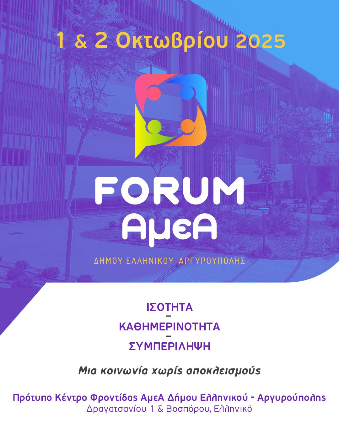 Ο Δήμος Ελληνικού – Αργυρούπολης διοργανώνει στις 1 και 2 Οκτωβρίου, το 1ο Πανελλαδικό Αυτοδιοικητικό FORUM για τα Άτομα με Αναπηρία, μια μεγάλη συνάντηση διαλόγου και ανταλλαγής απόψεων με στόχο την προώθηση της ισότητας, της καθημερινότητας χωρίς εμπόδια και της ουσιαστικής συμπερίληψης.