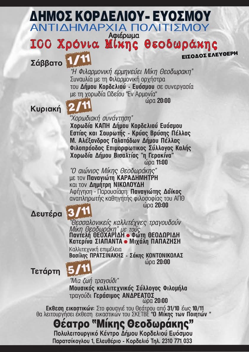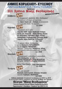 Τραγούδια και μουσικές που έγραψαν ιστορία, μελωδίες που σημάδεψαν ανεξίτηλα τις ψυχές μας και έγιναν φως, μετουσιώνοντας την πίστη σε έναν καλύτερο κόσμο με ελευθερία, δημοκρατία και δικαιοσύνη, ξαναζωντανεύουν στο πλαίσιο των επετειακών εκδηλώσεων που διοργανώνει, από τη 1 έως τις 5 Νοεμβρίου, ο Δήμος Κορδελιού – Ευόσμου για τα 100 χρόνια από τη γέννηση του μεγάλου Έλληνα μουσικοσυνθέτη, Μίκη Θεοδωράκη.