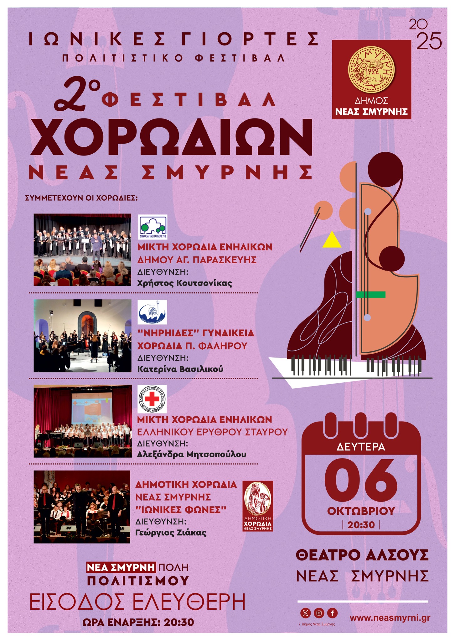 Ένας νέος πολιτιστικός θεσμός επανέρχεται για δεύτερη χρονιά στη Νέα Σμύρνη. Πρόκειται για το 2ο Φεστιβάλ Χορωδιών που θα πραγματοποιηθεί την Δευτέρα 6 Οκτωβρίου 20:30 στο Άλσος.