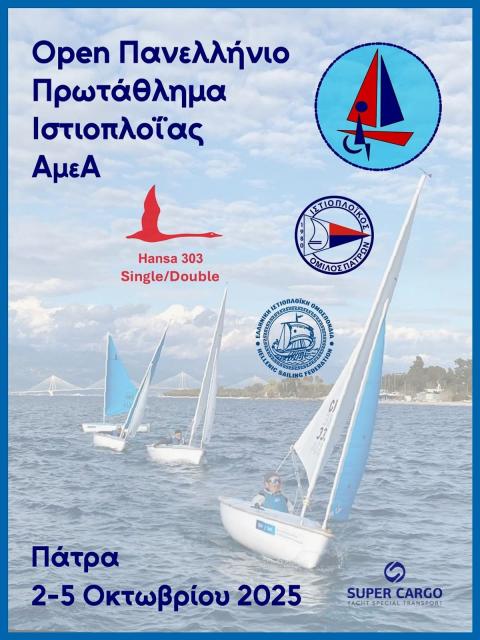 O Ιστιοπλοϊκός Όμιλος Πατρών διοργανώνει, με ανάθεση της Ελληνικής Ιστιοπλοϊκής Ομοσπονδίας, το Πανελλήνιο Πρωτάθλημα Ιστιοπλοΐας ΑΜΕΑ με σκάφη τύπου HANSA 303 Single και Double.