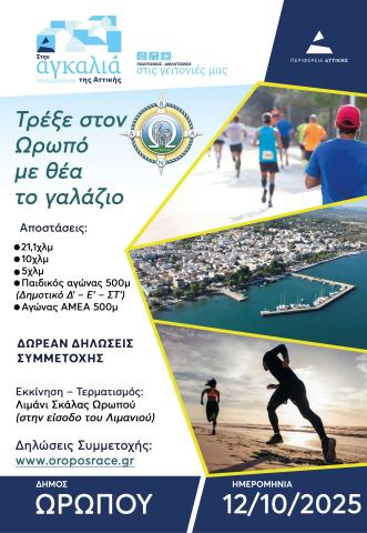 Μεγάλη γιορτή του αθλητισμού στον Δήμο Ωρωπού και δρομείς από όλη την Ελλάδα δηλώνουν συμμετοχή στο «OROPOS SEASIDE RACE» που θα γίνει 12 Οκτωβρίου 2025 στο παραλιακό μέτωπο από την είσοδο του λιμανιού της Σκάλας Ωρωπού μέχρι την Αγία Μαρίνα Αγίων Αποστόλων Καλάμου. Οι συμμετοχές γίνονται ηλεκτρονικά στην επίσημη ιστοσελίδα της διοργάνωσης και είναι δωρεάν.