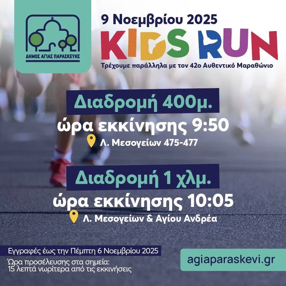 Στο πλαίσιο του 42ου Αυθεντικού Μαραθωνίου της Αθήνας, ο Δήμος Αγίας Παρασκευής διοργανώνει την Κυριακή 9 Νοεμβρίου 2025 τον δικό του Αγώνα Δρόμου Μικρών Παιδιών, δίνοντας στους μαθητές των Δημοτικών Σχολείων της πόλης την ευκαιρία να ζήσουν τη χαρά της συμμετοχής και του ευ αγωνίζεσθαι.