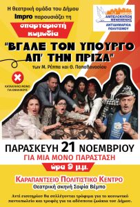 ΣΤΟ Καραπάντσειο Πολιτιστικό Κέντρο, Θεατρική Σκηνή “Σοφία Βέμπο” στην παρουσίαση της σπαρταριστής κωμωδίας των Μιχάλη Ρέππα και Θανάση Παπαθανασίου “Βγάλε τον υπουργό από την πρίζα” που θα παρουσιάσει η θεατρική ομάδα του Δήμου “IMPRO”. Η παράσταση είναι ακατάλληλη για ανηλίκους.