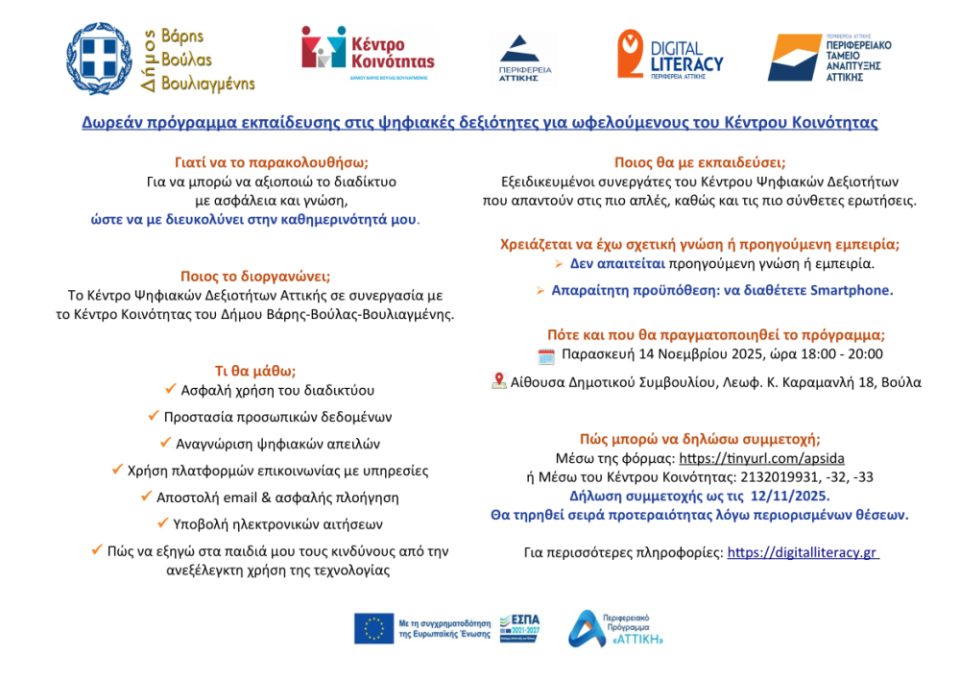 Ο Δήμος Βάρης Βούλας Βουλιαγμένης, μέσω του Κέντρου Κοινότητας, σε συνεργασία με το Κέντρο Ψηφιακών Δεξιοτήτων Αττικής και με την υποστήριξη της Περιφέρειας Αττικής, διοργανώνει δωρεάν πρόγραμμα εκπαίδευσης στις ψηφιακές δεξιότητες για τους ωφελούμενους του Κέντρου Κοινότητας.