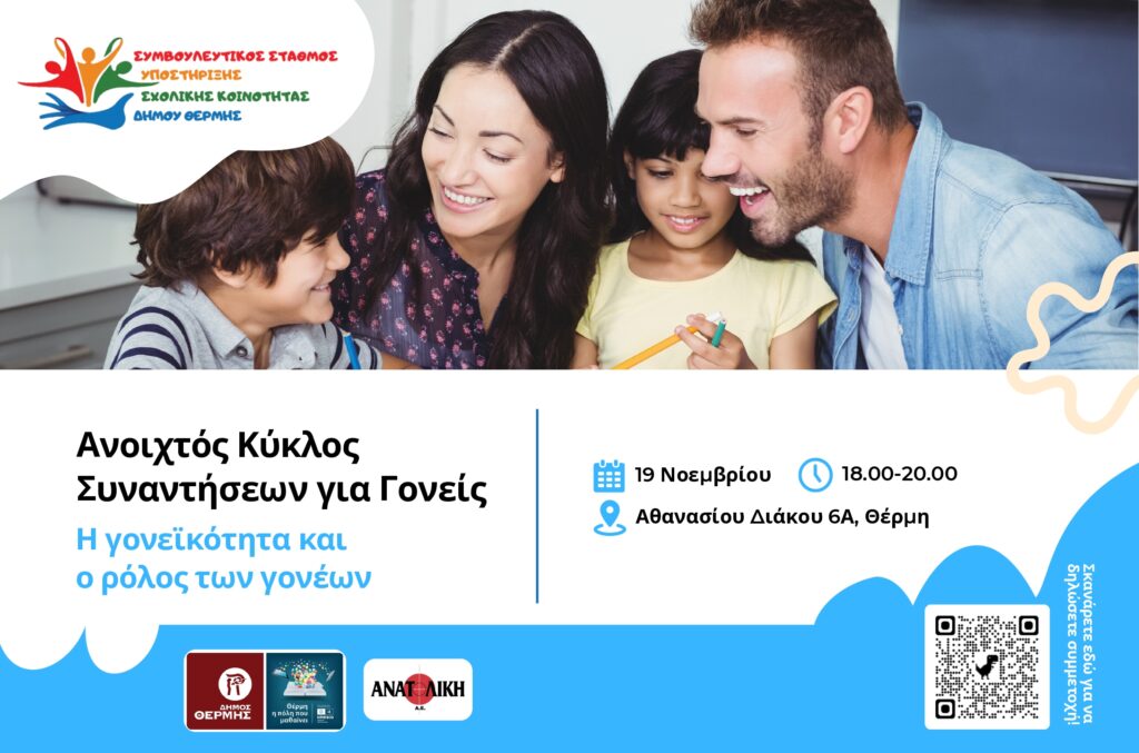 Ο Δήμος Θέρμης, μέσω της Διεύθυνσης Παιδείας, Νεολαίας, Δια Βίου Μάθησης και Απασχόλησης και του Συμβουλευτικού Σταθμού Υποστήριξης Σχολικής Κοινότητας, διοργανώνει έναν ανοιχτό κύκλο επτά δωρεάν συναντήσεων για γονείς και κηδεμόνες. Η δράση υλοποιείται από την ΑΝΑΤΟΛΙΚΗ Α.Ε., Αναπτυξιακό Οργανισμό Τοπικής Αυτοδιοίκησης, σε συνεργασία με τις σχολικές μονάδες και την Ένωση Συλλόγων Γονέων και Κηδεμόνων Μαθητών & Μαθητριών Δήμου Θέρμης.