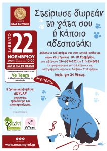 Την δυνατότητα να στειρώσουν δωρεάν τη γάτα τους ή κάποιο αδεσποτάκι της γειτονιάς παρέχει στους δημότες η Αστική Πανίδα του Δήμου Νέας Σμύρνης. Η συγκεκριμένη δράση ισχύει για 30 ζώα.