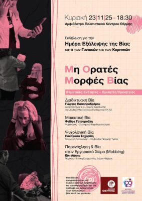 Εκδήλωση με θέμα «Οι μορφές βίας – Η βία κατά των γυναικών» διοργανώνει η Δημοτική Επιτροπή Ισότητας του Δήμου Θέρμης. Θα πραγματοποιηθεί την Κυριακή 23 Νοεμβρίου 2025 και ώρα 18:30 στο αμφιθέατρο του Πολιτιστικού Κέντρου Θέρμης.